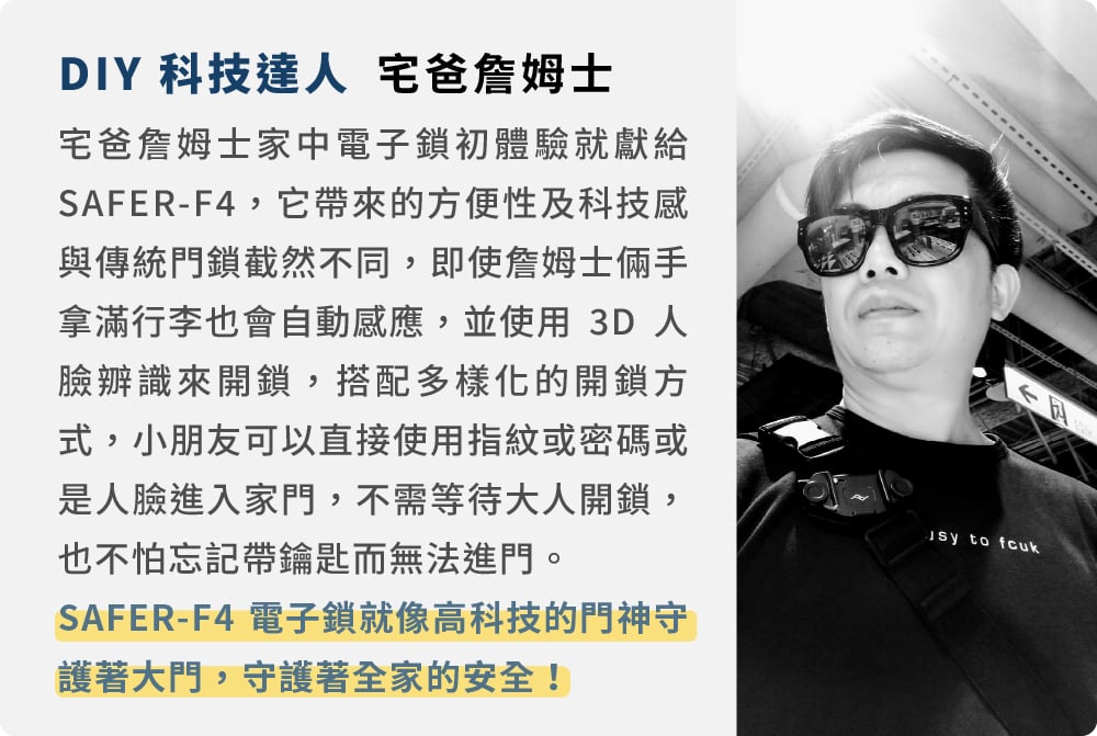 目前市面電子鎖能達到的最高等級,我們特別採用鋼化玻璃面板、首創的指紋技術,讓 SAFER-F4 成為市面最防水、還能兼顧到人臉及指紋辨識的唯一最佳選擇!市調了市面上其他電子鎖後,我們發現指紋辨識常常無法通過,原因就是「手上的溼氣和油」,但這不應該是阻礙你回家的原因!